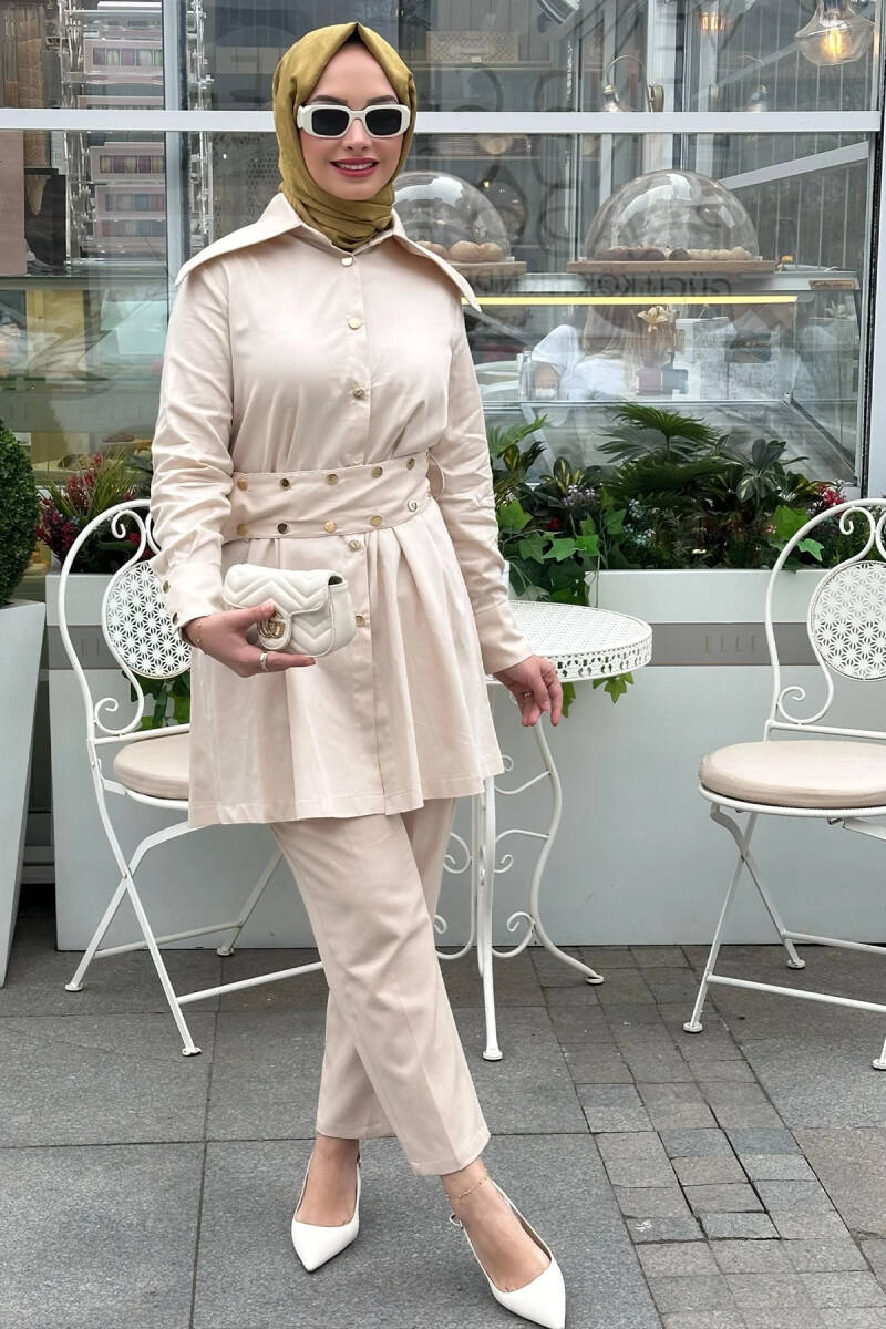 Mahza 102 Kemerli Pamuk Kumaş Tunik Bej