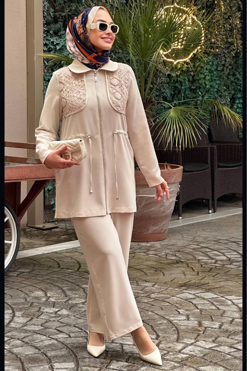 Belden bağcıklı, göğüs kısım dantel detaylı tam kalıp takım