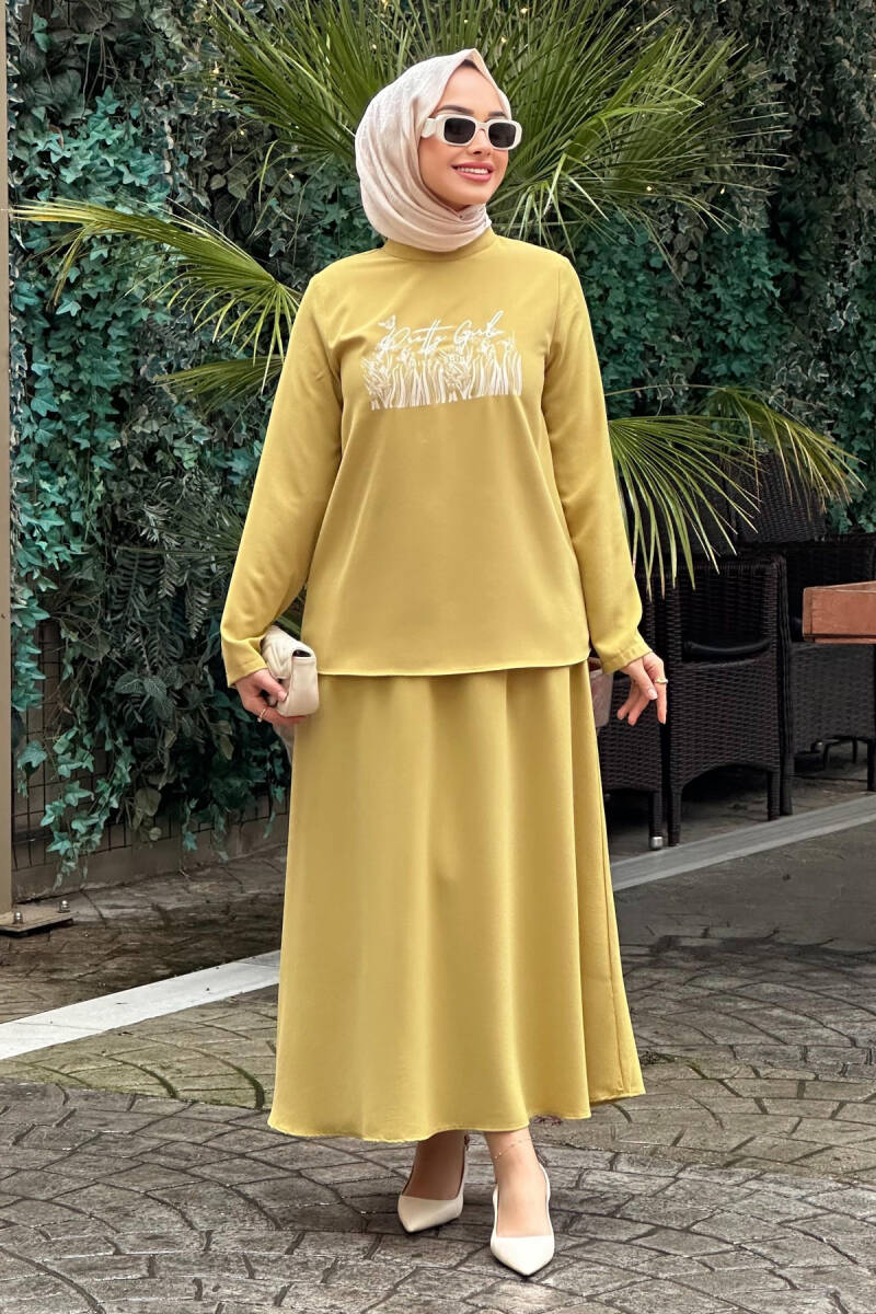 Mahza 8166 Baskı Detaylı Etek Takım Yağ Yeşili