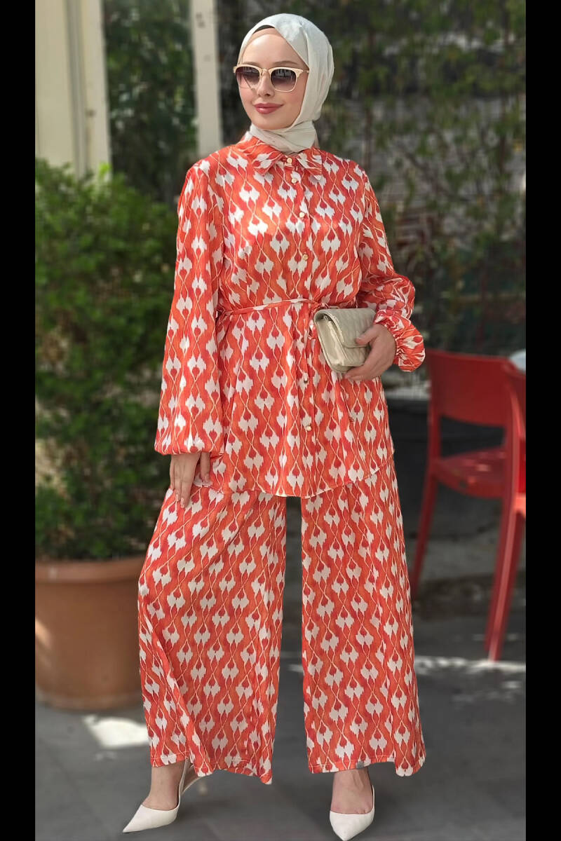 Mahza 8195 İpek Saten Bol Paça Pantolon Takım Turuncu