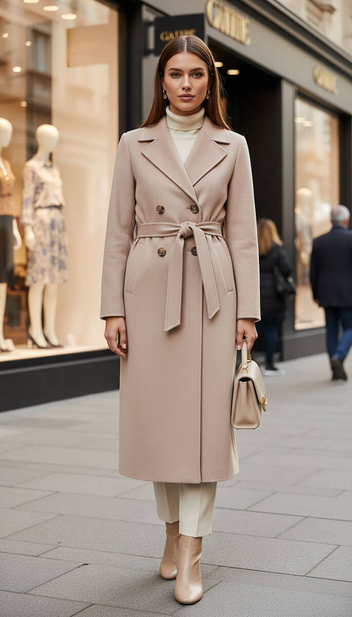 Mahza Kaşe Kumaş Maxi Boy Astarlı 135 cm Kaban 7663 Bej