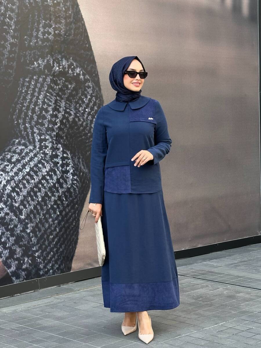 Mahza Modal Kumaş Süet Detaylı Yeni Sezon Etek Takım 8201 İndigo