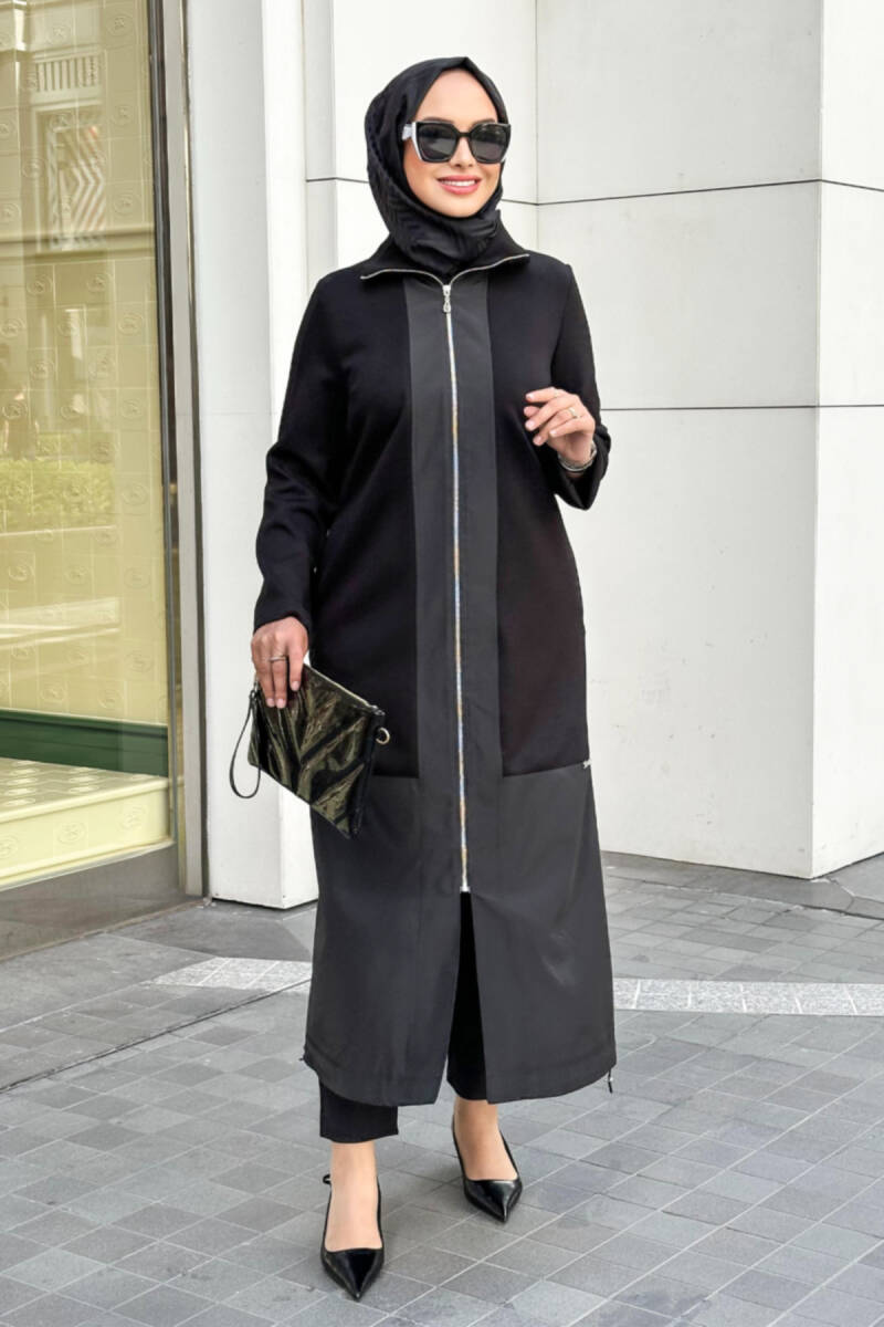 Mahza Kaşe Kumaş Astarlı Yakası Çıkarılabilir Kürklü 120 cm Kaban 7666 Siyah