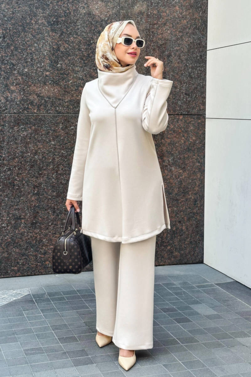 Mahza Yaka Detaylı Oyşo Kumaş Yeni Sezon Pantolon Takım 8200 Bej