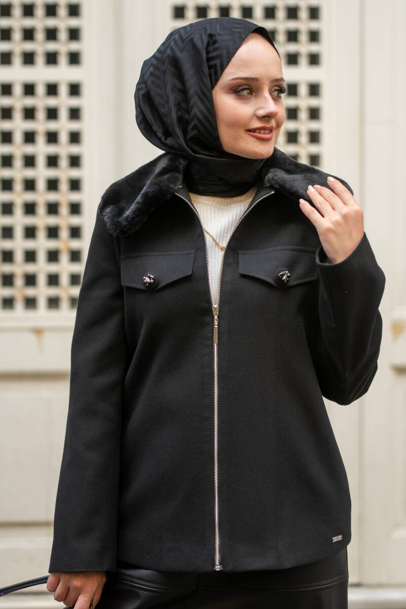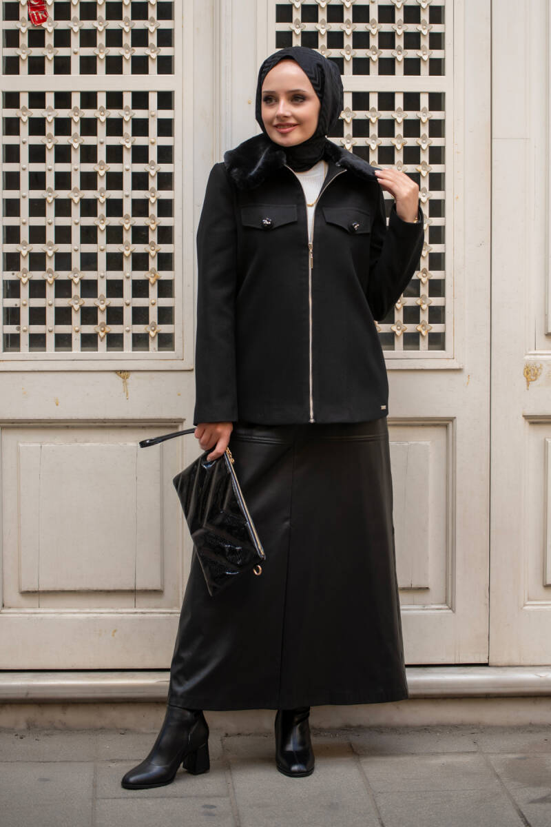 Gelince Haber VerMahza Yeni Sezon Kaşe Kumaş Astarlı 65 cm Ceket 7661 Siyah